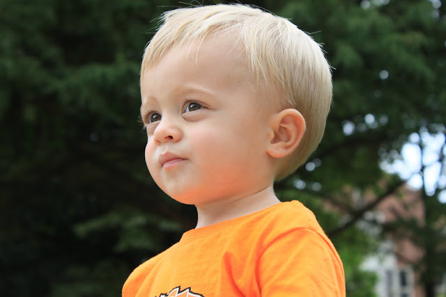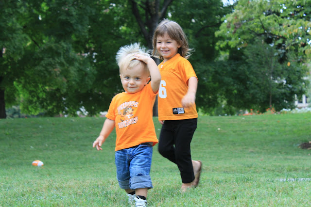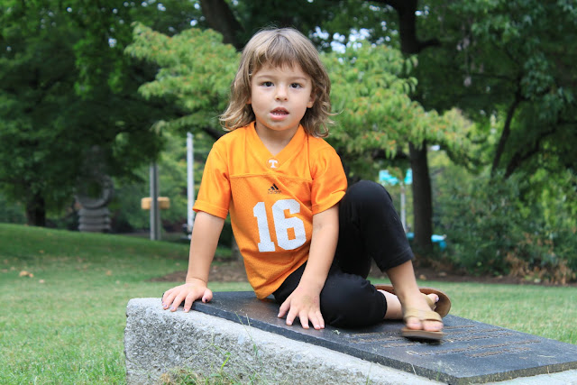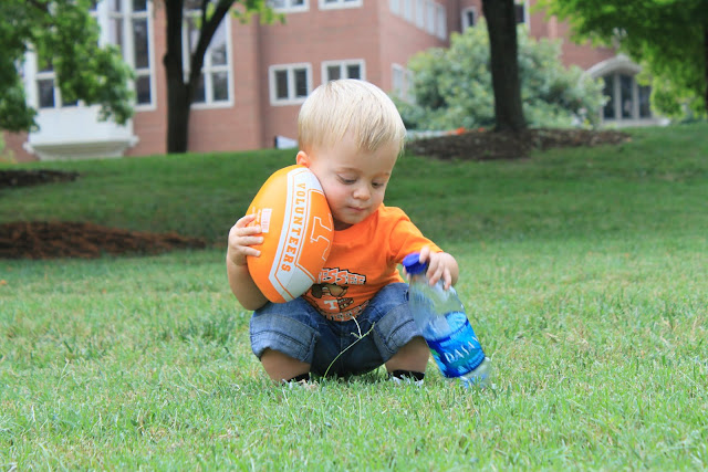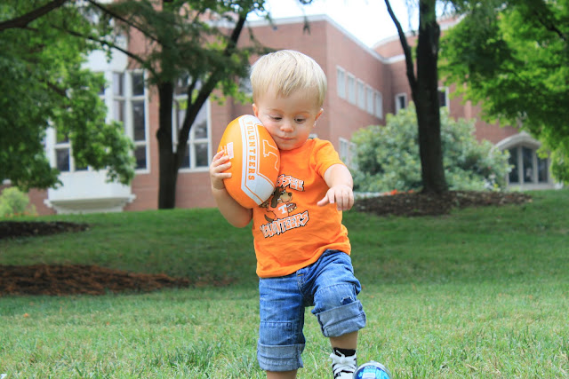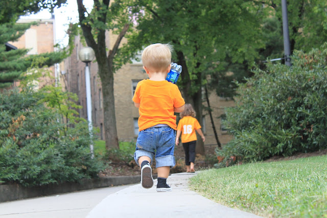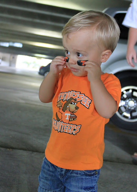 Daddy would say heck no!...but the VOLS run a close second. This trip didn't really turn out the way we thought it would. I kind of forgot how E gets around a crowd of people...and let me tell you...this was a CROWD! One of the biggest ones I have ever seen. And trust me...you could see EVERYONE because we were almost at the tip top of the stadium. About 10 minutes after being there all little E wanted to do was get the heck out of there...and Ri was out like a light. Mommy spent the entire first half of the fame outside of the stadium trying to entertain little man. Thank goodness it wasn't long before he passed out. And thank goodness Daddy and Uncle Chris were ready to go at half time. Needless to say...we probably won't be going to a football game like this one until E gets a couple more years on him. Don't get me wrong...the trip was definitely worth it...getting to spend time with family. I only got a few pics inside the stadium...but don't worry...got plenty of the angels running around after the game.