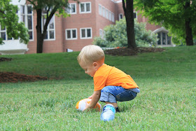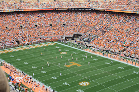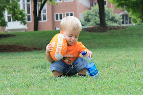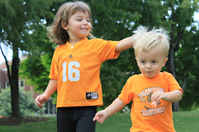 Daddy would say heck no!...but the VOLS run a close second. This trip didn't really turn out the way we thought it would. I kind of forgot how E gets around a crowd of people...and let me tell you...this was a CROWD! One of the biggest ones I have ever seen. And trust me...you could see EVERYONE because we were almost at the tip top of the stadium. About 10 minutes after being there all little E wanted to do was get the heck out of there...and Ri was out like a light. Mommy spent the entire first half of the fame outside of the stadium trying to entertain little man. Thank goodness it wasn't long before he passed out. And thank goodness Daddy and Uncle Chris were ready to go at half time. Needless to say...we probably won't be going to a football game like this one until E gets a couple more years on him. Don't get me wrong...the trip was definitely worth it...getting to spend time with family. I only got a few pics inside the stadium...but don't worry...got plenty of the angels running around after the game.