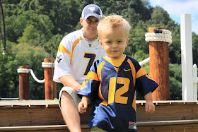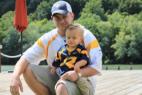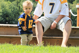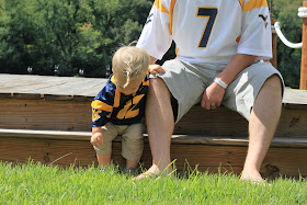 Are you ready for some football!!!? Daddy and Easton are...hence the WVU football jerseys. Yeah I know football season started a little while ago, but Mommy has been a little slow at posting pictures lately. Believe you me...I have tons of pics to share...just not much time on my hands these days. Well, I take that back...probably have the time, but find myself doing other things...or should I say enjoying other things like playing with my little man...oh yeah...and sleeping. My bed time these days usually lands around 8-8:30...causing my blog to take a back seat and also causing me to miss all my shows. "Oh well," I say...not really that important anyways.